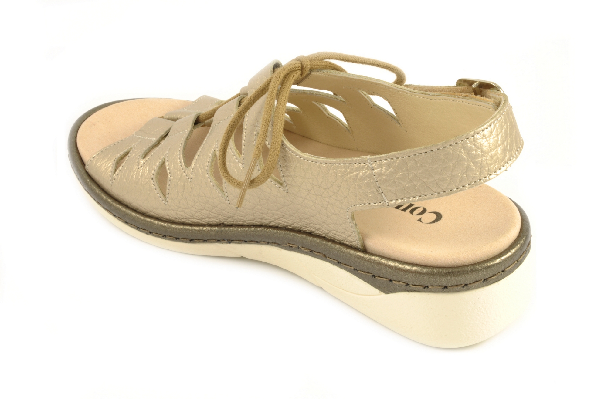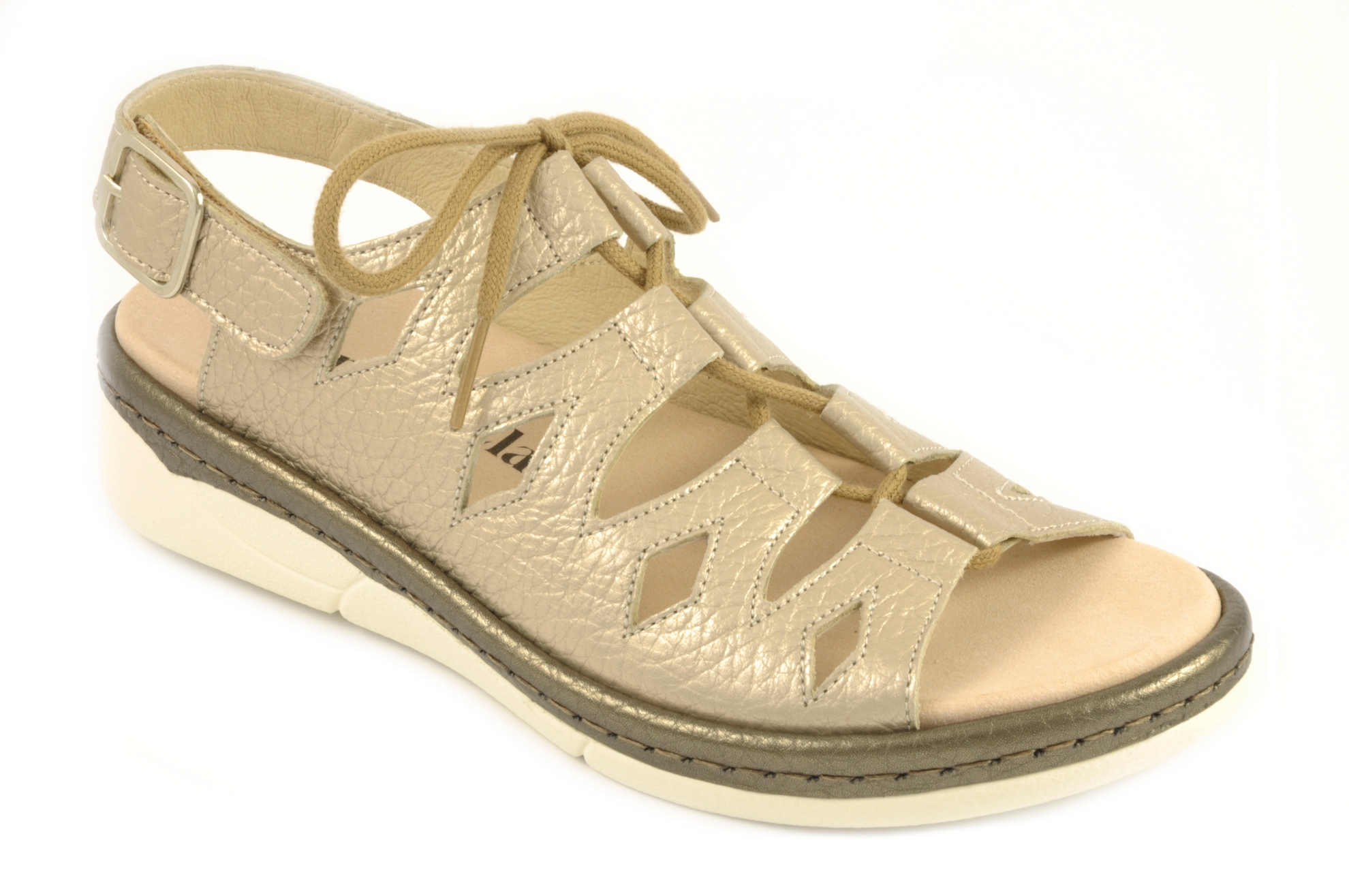 El incorporar a una sandalia un cierre con cordones, no solamente es una cuestión de diseño, es brindar la posibilidad a los pies muy anchos, que puedan ir cómodos sin sufrir ninguna molestia, puesto que regulando el cordón obtendrá el nivel de achura que requiera, o dicho de otra manera, mientras haya cordón para aflojar, no habrá limite de ancho. Esta repleta de aberturas mejorando la transpiración, lo cual evita que el pie se recaliente. La suela viene aconpañada por una plantilla acolchada la cual favorece a una mejor pisada, amortiguando el contacto con el suelo, disminuyendo la fatiga y las molestias en la planta del pie. Fabricada por Comfort Class en la Comunidad Valenciana, en la población de Sax.