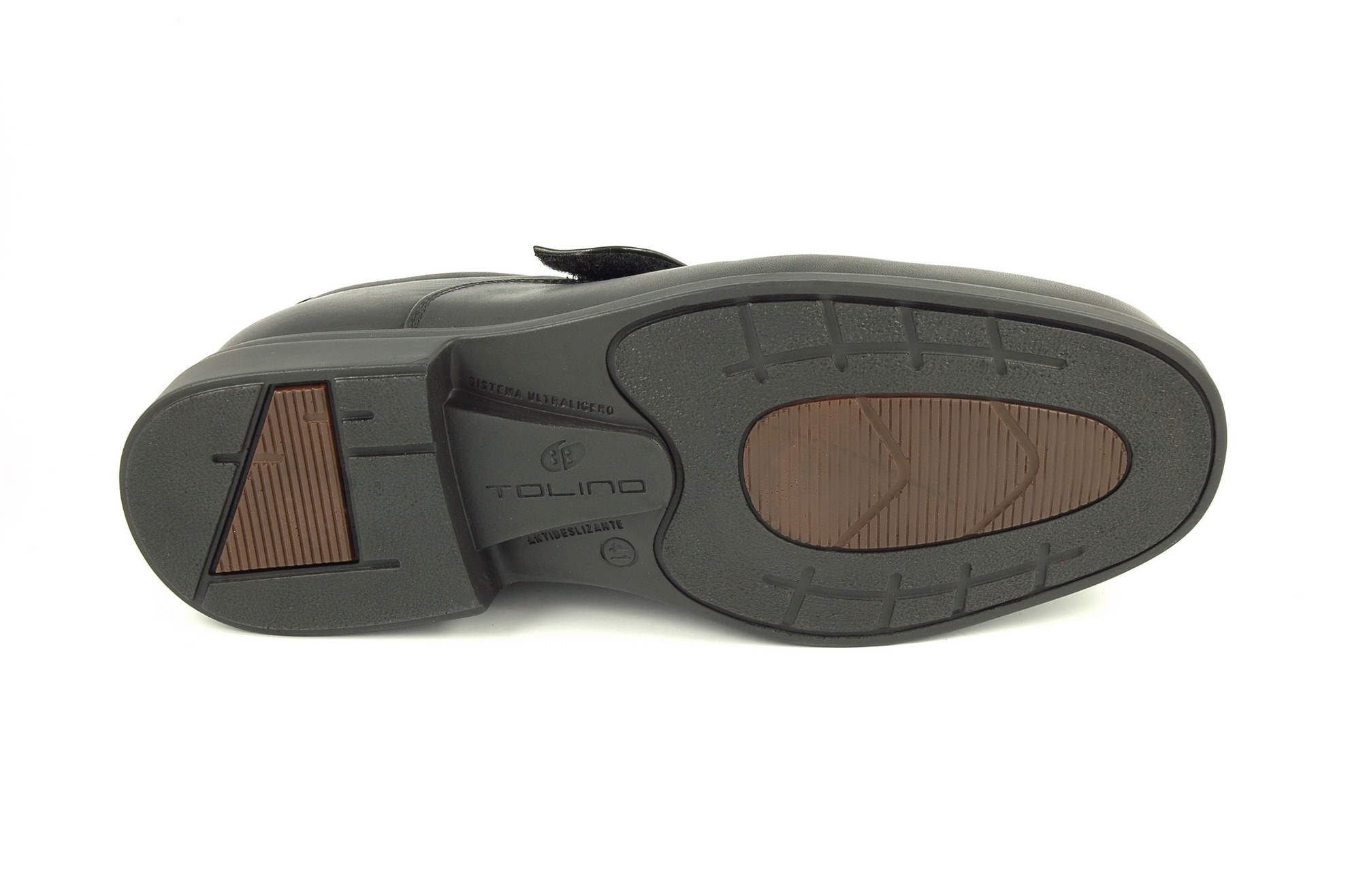 Zapato de ancho especial con velcro, para pies que requieran amplitud y comodidad. Tiene una buena base de apoyo y altura en la zona delantera, pensando en los pies anchos, de empeine alto o con dedos deformados. La piel empleada es de gran consistencia, no por ello deja de ser de fácil adaptación. Utiliza el forro técnico Climatemp, 100% transpirable y con una gran capacidad de absorción con su efecto termorregulador, ofrece el máximo confort. Otra solución para el confort es la suela Tolinolightest, proporciona ligereza con una óptima amortiguación a cada paso, evitando molestias en la planta del pie. Admite plantilla ortopédica al extraer la plantilla anatómica que viene de origen. Fabricado por Tolino en la población de Fuensalida, Provincia de Toledo.