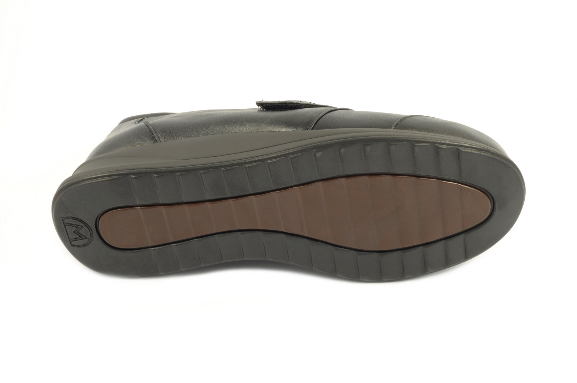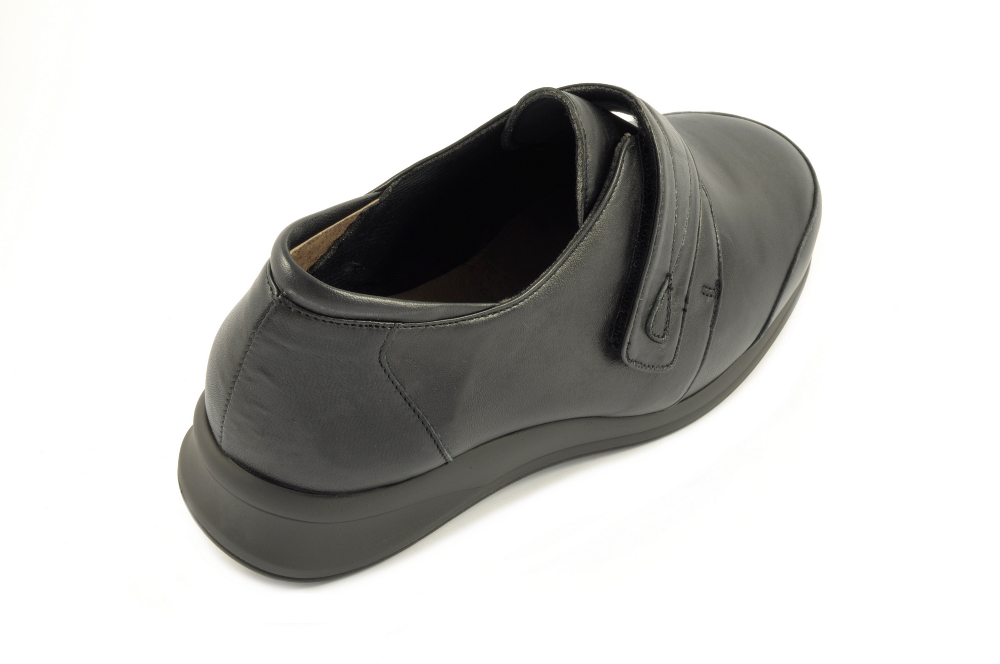Zapato con el ancho 16 en velcro, especial para plantilla ortopédica. Este modelo es de los más preparados para acoplar plantillas de tamaño grande, ya sea por la anchura, puesto que goza de más espacio en la zona de apoyo, como por el grosor, al tener una mayor altura en la parte de los dedos, empeine, y contrafuerte, ello también beneficiará a los pies muy anchos. El forro es de licra, material textil de inmediata adaptación, gracias a tener elasticidad. La parte exterior es de piel suave acompañada de licra, carece de costuras en las zonas conflictivas, que suelen ser el juante y los dedos, sobre todo si estas tienen callosidades, todos estos detalles garantizan un alto nivel de confort. El piso es firme, permitiendo que las plantillas queden bien asentadas. Fabricado por Trimas, empresa ubicada en la isla de Menorca, donde hay una larga tradición en la manufactura de calzado de alta calidad. El concepto «ancho 16», son los centímetros de contorno de la zona más ancha del zapato, la que abarca la parte delantera.