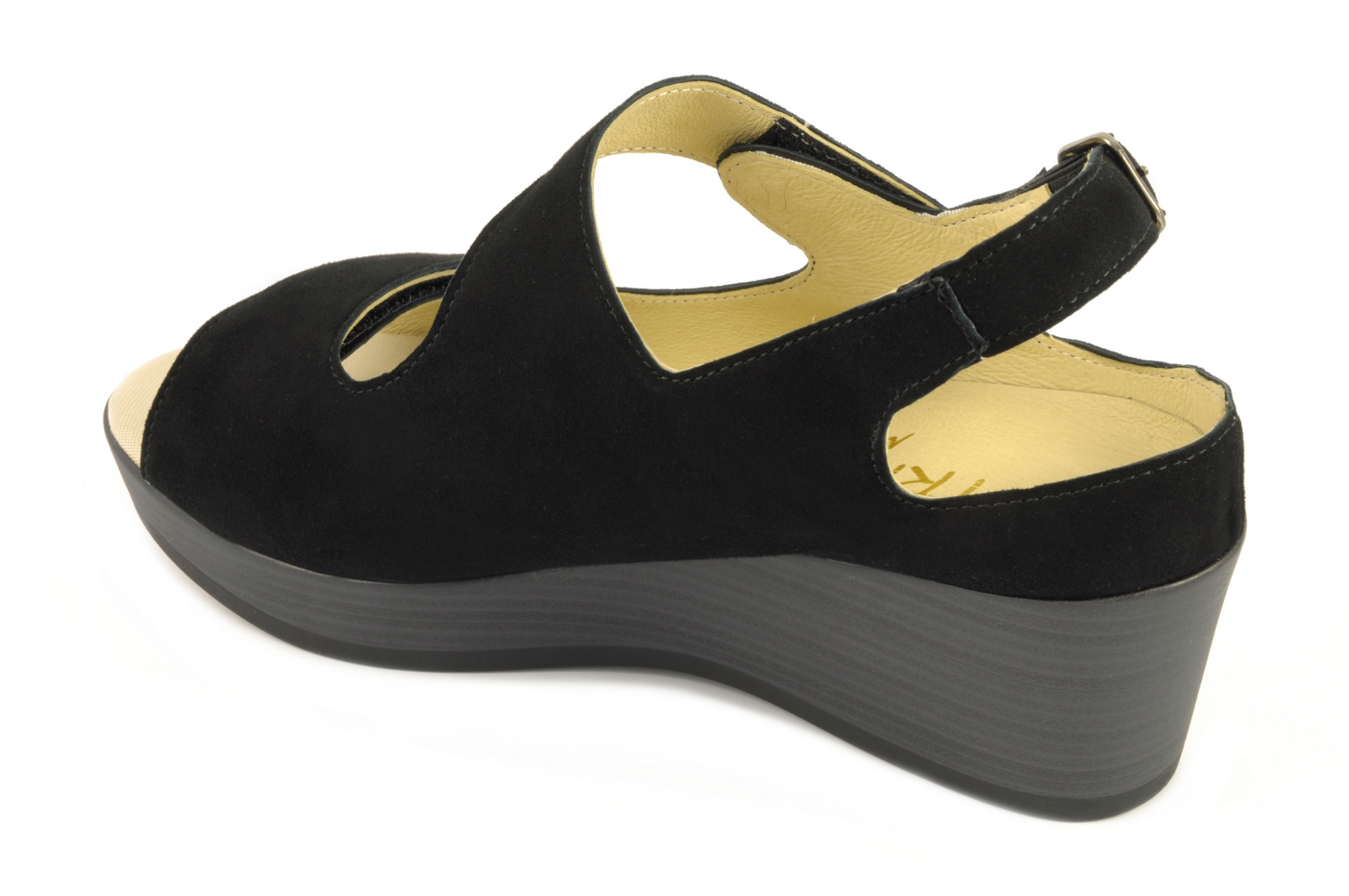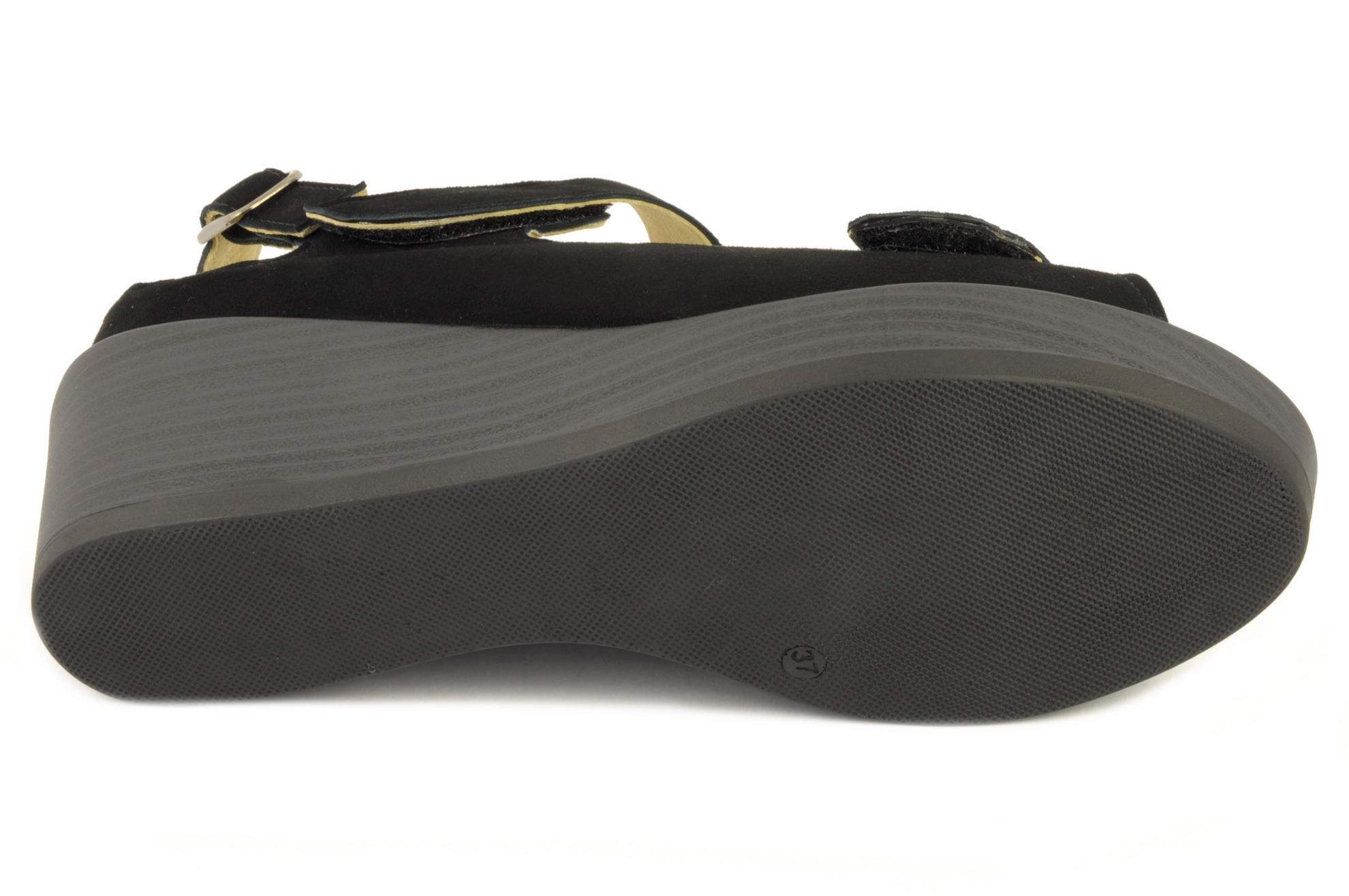 Resulta frecuente, cuando veis plataformas en los zapatos, os gustan pero no os atrevéis por su altura, hay que tener en cuenta, que este tipo de calzado no es tan alto como parece, dado que la cuña tiene una altura de 5,5 cm, pero gracias a la plataforma de 2,5cm, la altura real es de 3cm, de esta manera es más la sensación de ir muy alta, que la realidad, pues vas más elevada del suelo, pero la altura de la cuña no es tan exagerada como pueda parecer. Los velcros se adaptan fácilmente a diferentes anchuras, ya sea si tienes el pie ancho, o más bien estrecho, remarcar que aun resultando un modelo abierto, las zonas laterales abrazan el pie, lo cual evita que se desplaze lateralmente. Por su diseño, permite ser utilizada para situaciones que requieras ir más arreglada, pero manteniendo un alto grado de confort. En la zona del talón podemos ver la cubeta que sirve de apoyo para la plantilla, y en la parte delantera incorpora un elástico en cuyo interior se coloca para que quede fija. Fabricado por Trimas, empresa ubicada en la isla de Menorca, donde hay una larga tradición en la manufactura de calzado de alta calidad.